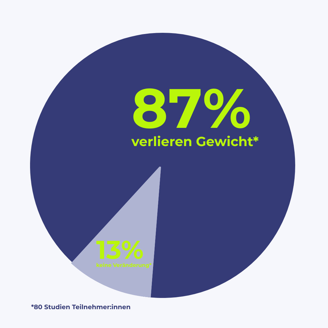 9 von 10 verlieren 2,4kg pro Monat Körpergewicht. Das hat unsere Verbraucherstudie mit 80 Teilnehmer:innen bestätigt. Snack.Control wirkt nachweislich, so dass auch du dein Wunschgewicht erreichst.